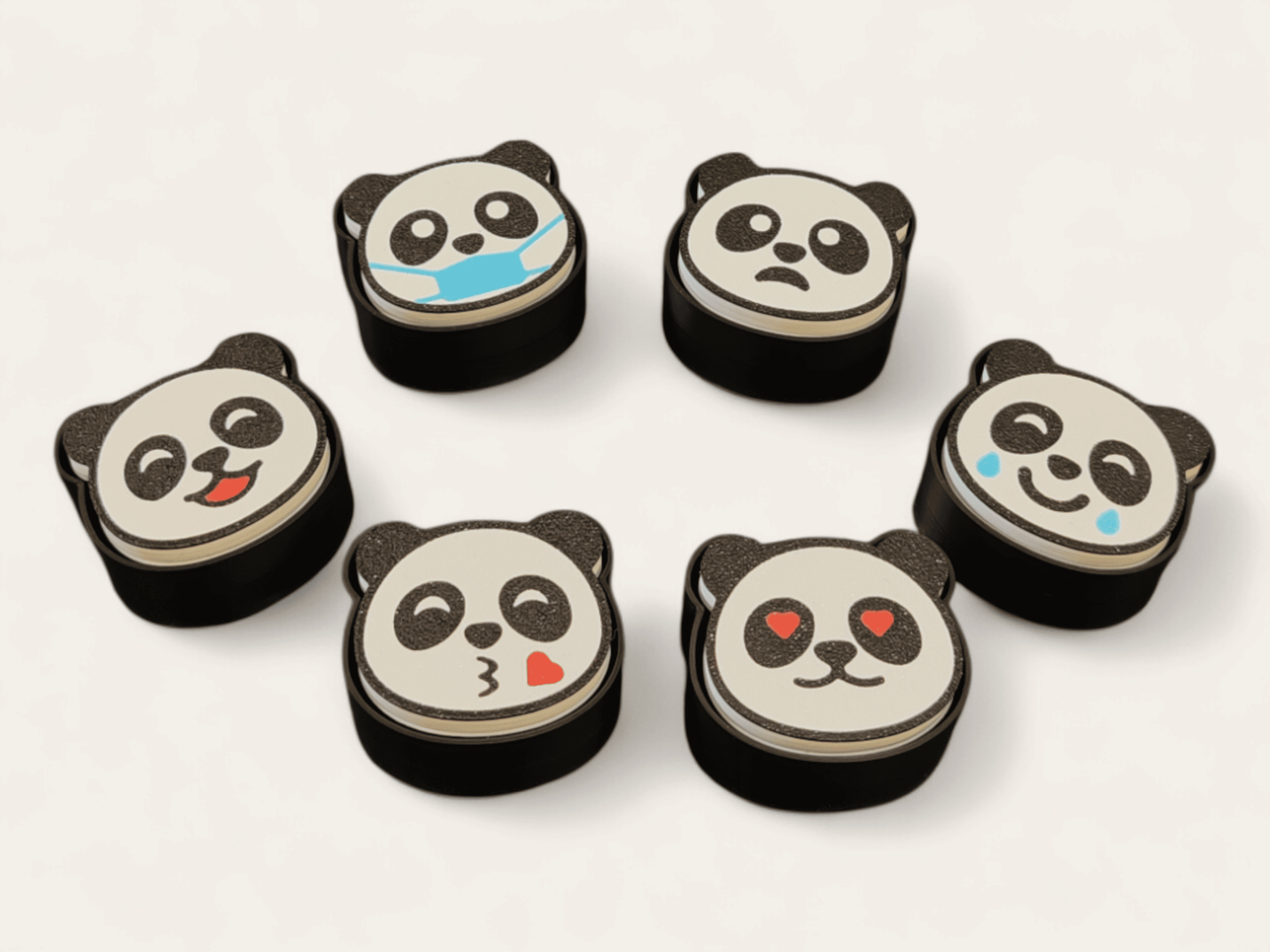 Clicker llavero con diseño de emoji de panda, en distintas expresiones y accesorios.