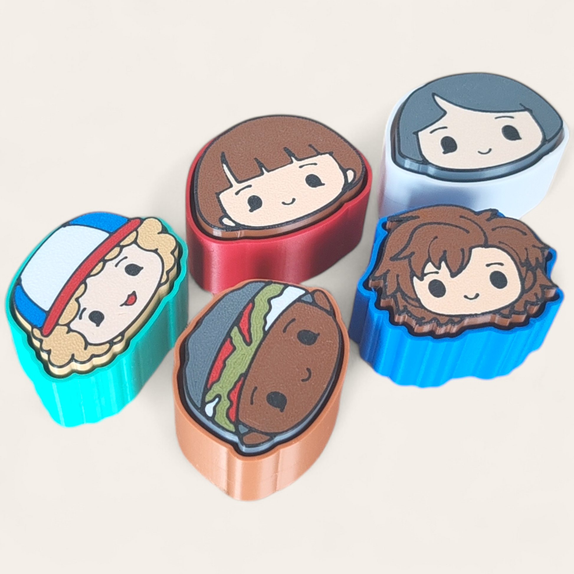 Clicker llavero inspirado en personajes del universo Stranger Things, como Dustin, Will, Mike, Lucas y Steve.