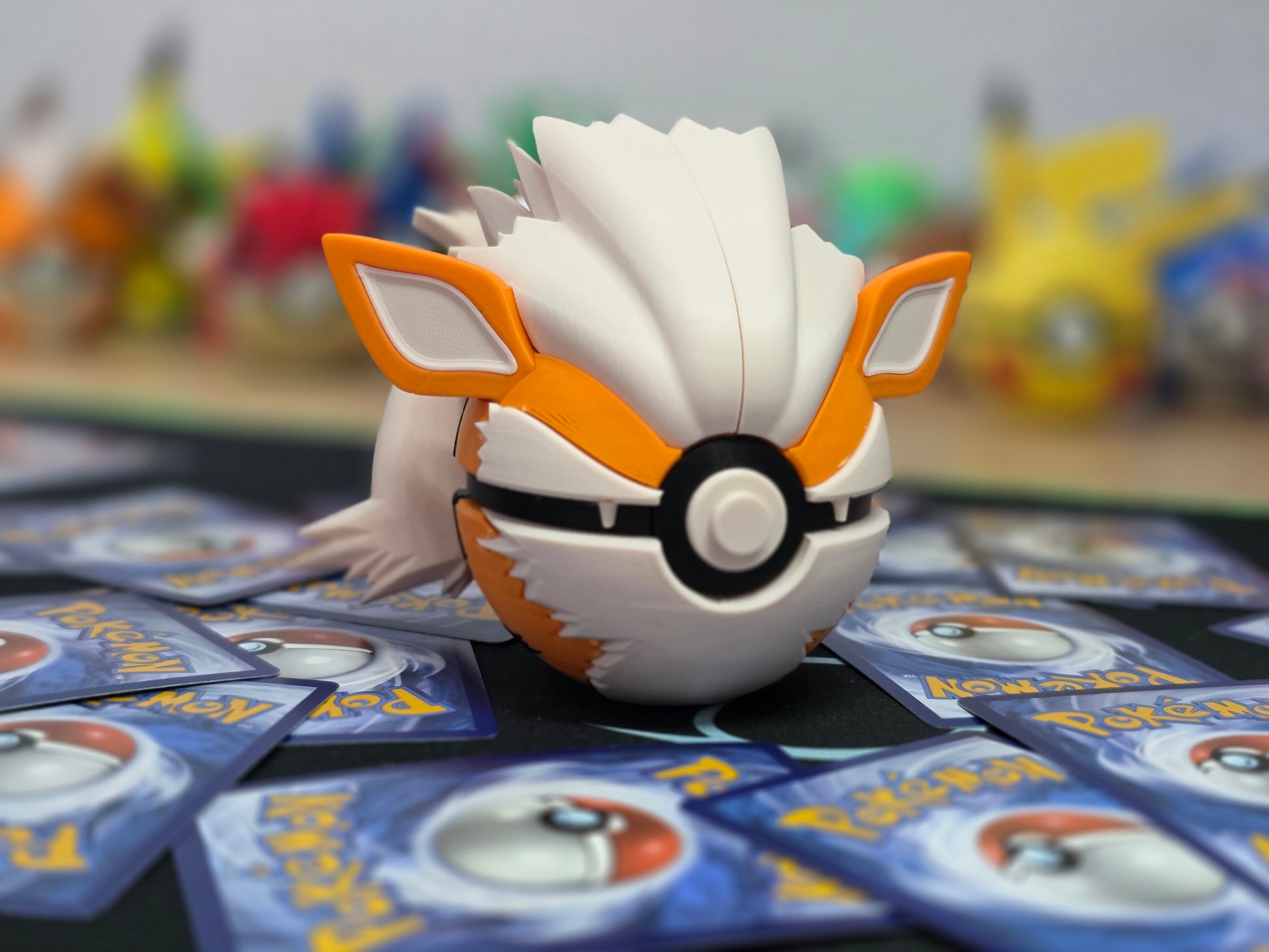 Pokeball reinterpretada con una criatura de tipo fuego en su forma final. Diseño robusto y elegante, pensada como pieza protagonista dentro de la colección.