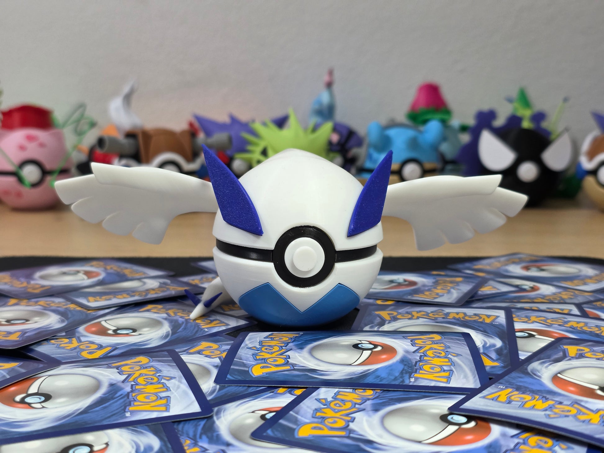 Pokeball inspirada en una criatura legendaria de diseño elegante y fluido. Ideal como pieza central de colección.